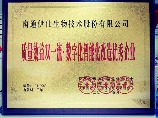經(jīng)江蘇省市場質(zhì)量監(jiān)督委員會、江蘇省數(shù)字化智能化改造調(diào)研中心、江蘇名牌事業(yè)促進會綜合調(diào)查審核評議,南通伊仕生物技術(shù)股份有限公司符合江蘇省質(zhì)量效益雙一流·創(chuàng)新驅(qū)動轉(zhuǎn)型升級優(yōu)秀企業(yè)的條件,被評為《江蘇省質(zhì)量效益雙一流·創(chuàng)新驅(qū)動轉(zhuǎn)型升級優(yōu)秀企業(yè)》。