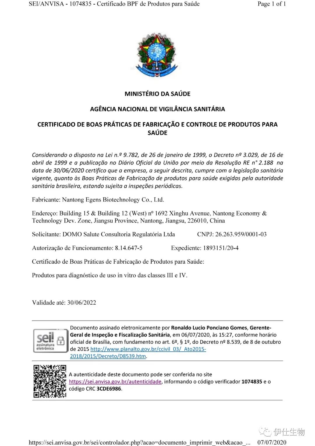 喜訊!伊仕生物新冠病毒抗原檢測(cè)試劑獲巴西醫(yī)療器械注冊(cè)證