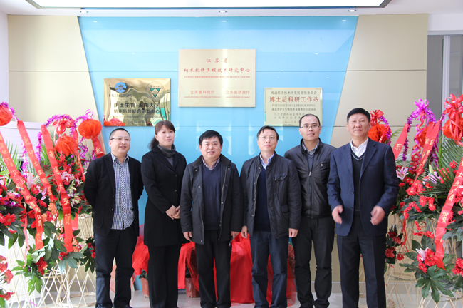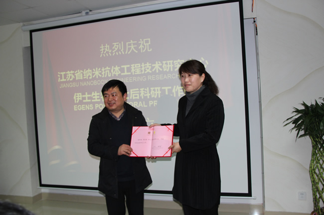 2014年3月20日,南通市伊士生物技術(shù)有限責(zé)任公司在伊士生物研究院會(huì)議室舉行了“江蘇省納米抗體工程技術(shù)研究中心、伊士生物博士后研究工作站揭牌儀式”。南通市科技局條件處 劉宏斌副處長(zhǎng),開(kāi)發(fā)區(qū)經(jīng)貿(mào)局周愛(ài)群副局長(zhǎng),科技處程李榮處長(zhǎng),東南大學(xué)生命科學(xué)研究萬(wàn)亞坤教授,南通大學(xué)吳啟運(yùn)教授,河南科技學(xué)院李桂榮副教授出席了這次揭牌儀式。