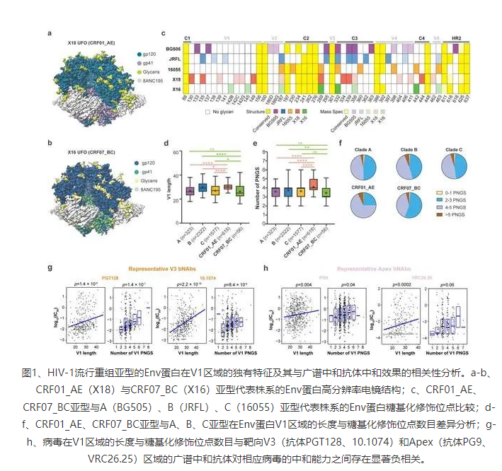 研究團(tuán)隊(duì)首先利用單分子冷凍電鏡技術(shù)與生物大分子質(zhì)譜全面揭示了CRF01_AE和CRF07_BC代表型株系的Env蛋白結(jié)構(gòu)與糖基化修飾(圖1a-c)。隨后從上述研究中獲得的線索出發(fā),對(duì)當(dāng)前數(shù)據(jù)庫(kù)中六千余條不同亞型的Env蛋白的V1區(qū)域進(jìn)行了跨亞型對(duì)比和分析。結(jié)果顯示,相比于其他亞型,CRF01_AE亞型的V1區(qū)域長(zhǎng)度顯著增長(zhǎng)(圖1d),且糖基化修飾位點(diǎn)數(shù)目顯著增多(圖1e-f)。進(jìn)一步對(duì)中和實(shí)驗(yàn)數(shù)據(jù)和V1區(qū)域特征的關(guān)聯(lián)分析則顯示CRF01_AE亞型在V1區(qū)域的上述特征會(huì)明顯削弱兩類廣譜中和抗體(分別靶向Env蛋白的apex與V3區(qū)域)對(duì)CRF01_AE亞型的中和效果(圖1g-h)。上述研究結(jié)果提示,應(yīng)盡量避免在CRF01_AE亞型的流行區(qū)域開(kāi)展靶向Apex或V3區(qū)域的免疫聚焦型疫苗或廣譜中和抗體的臨床試驗(yàn)。