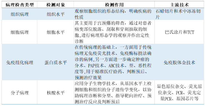 病理學根據(jù)發(fā)展階段的不同主要分為傳統(tǒng)病理技術(shù)(組織病理、細胞病理)、免疫組化病理和分子病理。傳統(tǒng)的組織病理建立在組織、細胞的水平上,可以通過病理醫(yī)師的顯微鏡診斷來判斷疾病的性質(zhì)(炎癥性病變還是腫瘤型病變、良性腫瘤還是惡性腫瘤等);免疫組化病理建立在蛋白質(zhì)水平上,可以進一步判斷腫瘤的組織來源、原發(fā)部位、病理分型、殘留邊緣癌細胞等,除了診斷作用以外還具有指導預后的作用;分子病理建立在核酸分子水平上,可以確定腫瘤的基因突變類型,用于后續(xù)靶向藥物的指導以實現(xiàn)精準醫(yī)療。