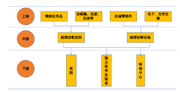病理行業(yè)產(chǎn)業(yè)鏈包括上游原料市場、中游試劑設備市場和下游需求診斷市場。原料包括生物與化學原材料以及各種機械零配件,分子病理還會涉及到引物、探針等;中游包括病理診斷試劑和病理診斷儀器;下游需求主要來自于醫(yī)院、第三方獨立醫(yī)學實驗室、體檢中心、政府等。