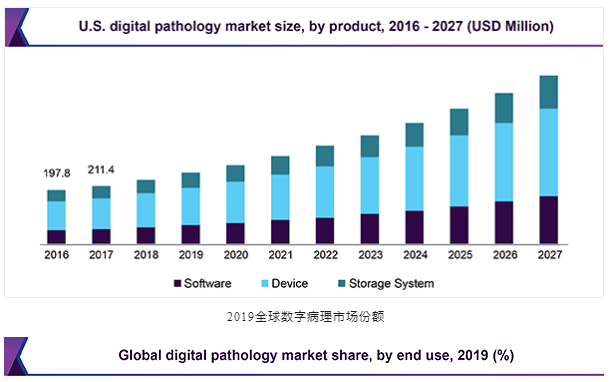 據(jù)2020年世界病理學大會報告,預計到2024年,病理學市場規(guī)模將從2019年的303億美元達到444億美元,從2019年到2024年的復合年增長率為6.1%。據(jù)GrandViewResearch預測,2019年全球數(shù)字病理學市場規(guī)模為7.676億美元,預計到2027復合年增長率為11.8%。根據(jù)最終用途,醫(yī)院在2019年占據(jù)了領(lǐng)先的市場份額。醫(yī)院采用數(shù)字掃描技術(shù)以加快診斷速度并提高患者依從性。就收入而言,2019年北美市場份額最大。