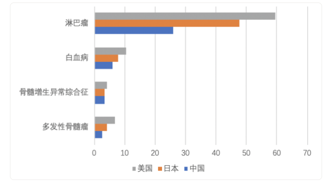 根據(jù)上圖所示,多發(fā)性骨髓瘤在中國、日本、美國的發(fā)病率分別為2.5/100000,4.4/100000,6.7/100000;骨髓增生異常綜合癥在中國、日本、美國的發(fā)病率3.4/100000,3.5/100000,4.2/100000;白血病在中國、日本、美國的發(fā)病率分別為6.1/100000,7.8/100000,10.6/100000;淋巴瘤在中國、日本、美國的發(fā)病率分別為25.9/100000,47.6/100000,59.4/100000。由此可見2008年-2015年的四種血液腫瘤發(fā)病率呈現(xiàn)逐年上升的趨勢,其中淋巴瘤發(fā)病率最高,平均高達44.3。