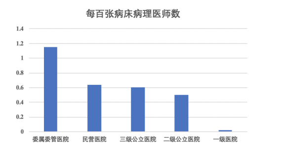如上圖所示,其中委屬委管醫(yī)院每百張病床病理醫(yī)師數(shù)僅為1.15,三級公立醫(yī)院、二級公立醫(yī)院和民營醫(yī)院分別為0.60、0.50及0.64。根據(jù)最新發(fā)布的《2019年全國病理質(zhì)量報告》顯示,在不同級別的醫(yī)院中,全國平均每百張病床病理醫(yī)師數(shù)量為0.55,病理醫(yī)師數(shù)量奇缺的狀況沒有改善,各省、自治區(qū)、直轄市均未達到2009年《病理科建設與管理指南(試行)》(以下簡稱《指南》)的最低要求(每百張床1-2名病理醫(yī)師)。