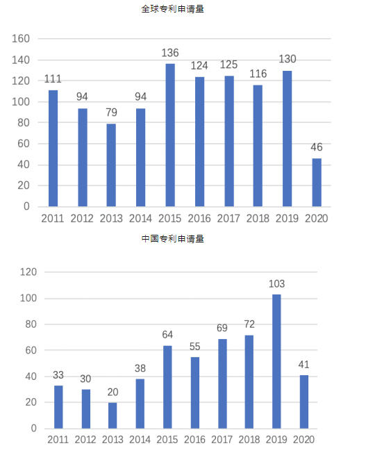 上圖所示為以“病理診斷”和“細胞病理”進行全球檢索得到的近10年的專利申請情況。從圖中可以看出,病理診斷領(lǐng)域近10年約有1055件專利申請(由于發(fā)明專利有18個月公開的滯后期,實用新型從申請到公開也需一段時間,因此2019年和2020年數(shù)據(jù)有所偏差),其中發(fā)明專利604件、實用新型專利179件。從圖2中可以看出,全中國病理診斷領(lǐng)域近10年約有525件專利申請(由于發(fā)明專利有18個月公開的滯后期,實用新型從申請到公開也需一段時間,因此2019年和2020年數(shù)據(jù)有所偏差)。