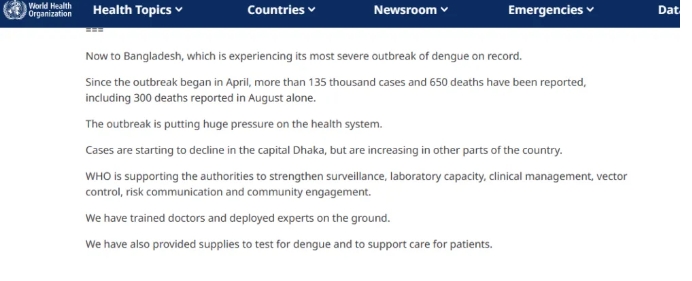 世衛(wèi)組織(WHO)周三表示,孟加拉國正在經(jīng)歷有記錄以來最嚴(yán)重的登革熱疫情,自4月份疫情爆發(fā)以來,該國報(bào)告了超過13.5萬例登革熱病例,已有650多人死亡。